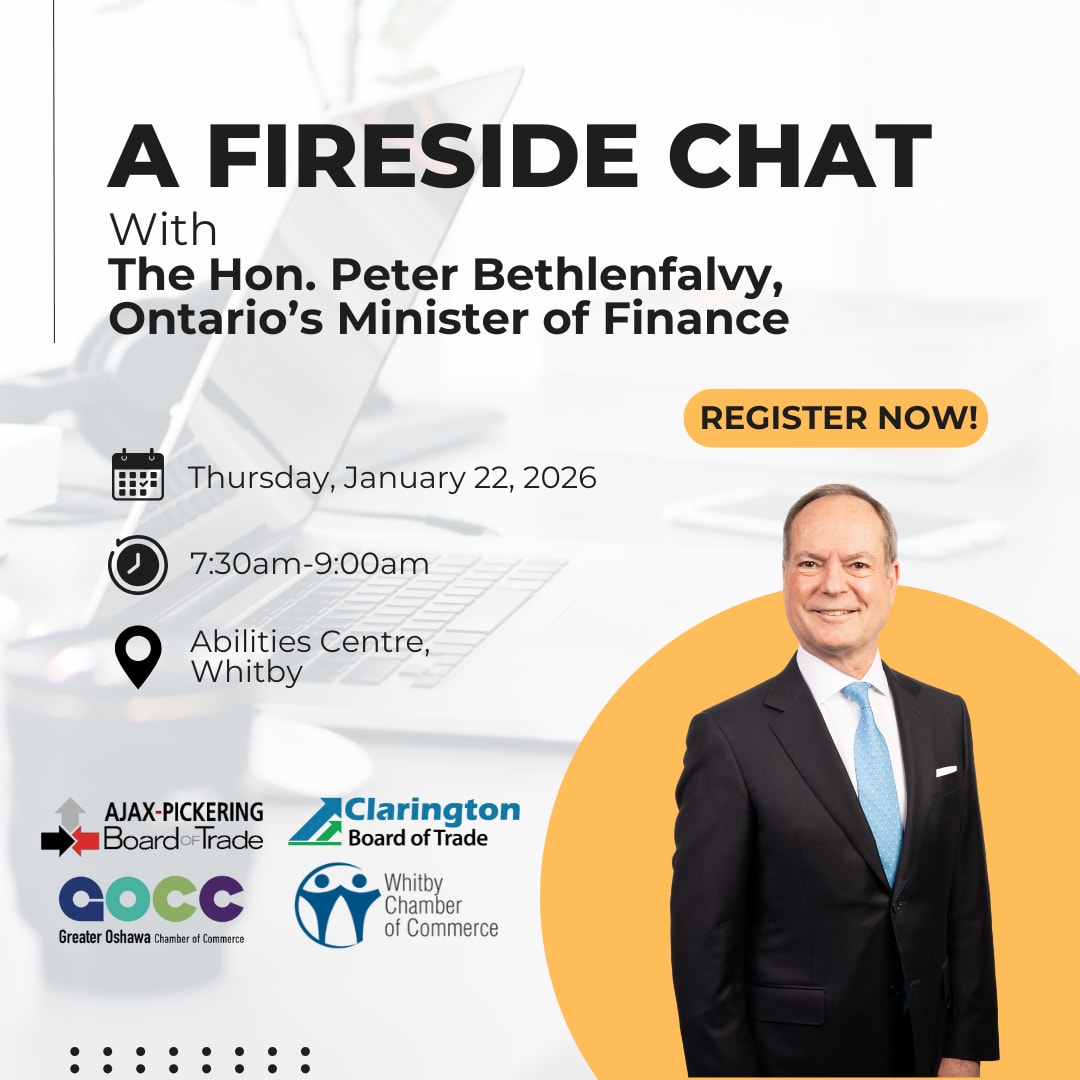 Join business leaders from across Durham Region for a fireside chat with Ontario's Minister of Finance, the Hon. Peter Bethlenfalvy, presented in partnership with the Ajax-Pickering Board of Trade (APBOT), the Clarington Board of Trade (CBOT), the Whitby Chamber of Commerce, and the Greater Oshawa Chamber of Commerce (GOCC).