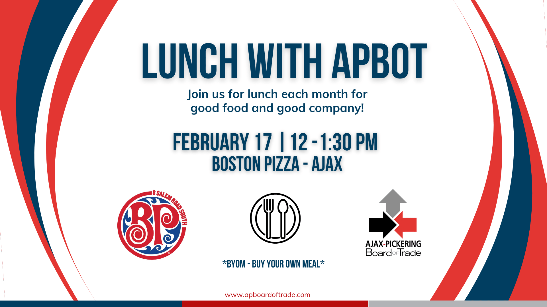 Our next lunch will be at Boston Pizza - Ajax on February 17th from 12:00 PM - 1:30 PM.