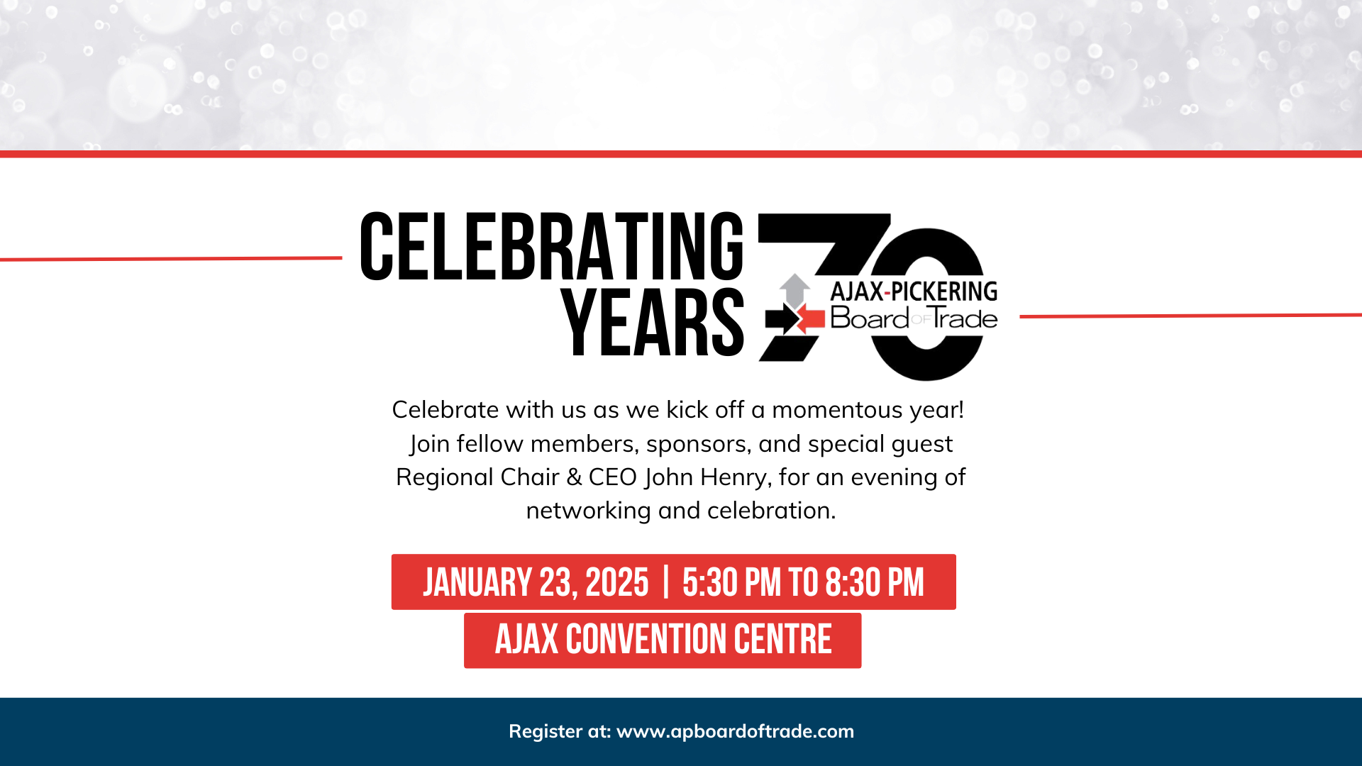 This reception-style event is the perfect opportunity to reflect on the achievements of the past year, connect with the local business community and share your goals for 2025. Don't miss out on this exciting event as we launch a year of festivities in honour of the Ajax-Pickering Board of Trade's 70th Anniversary!