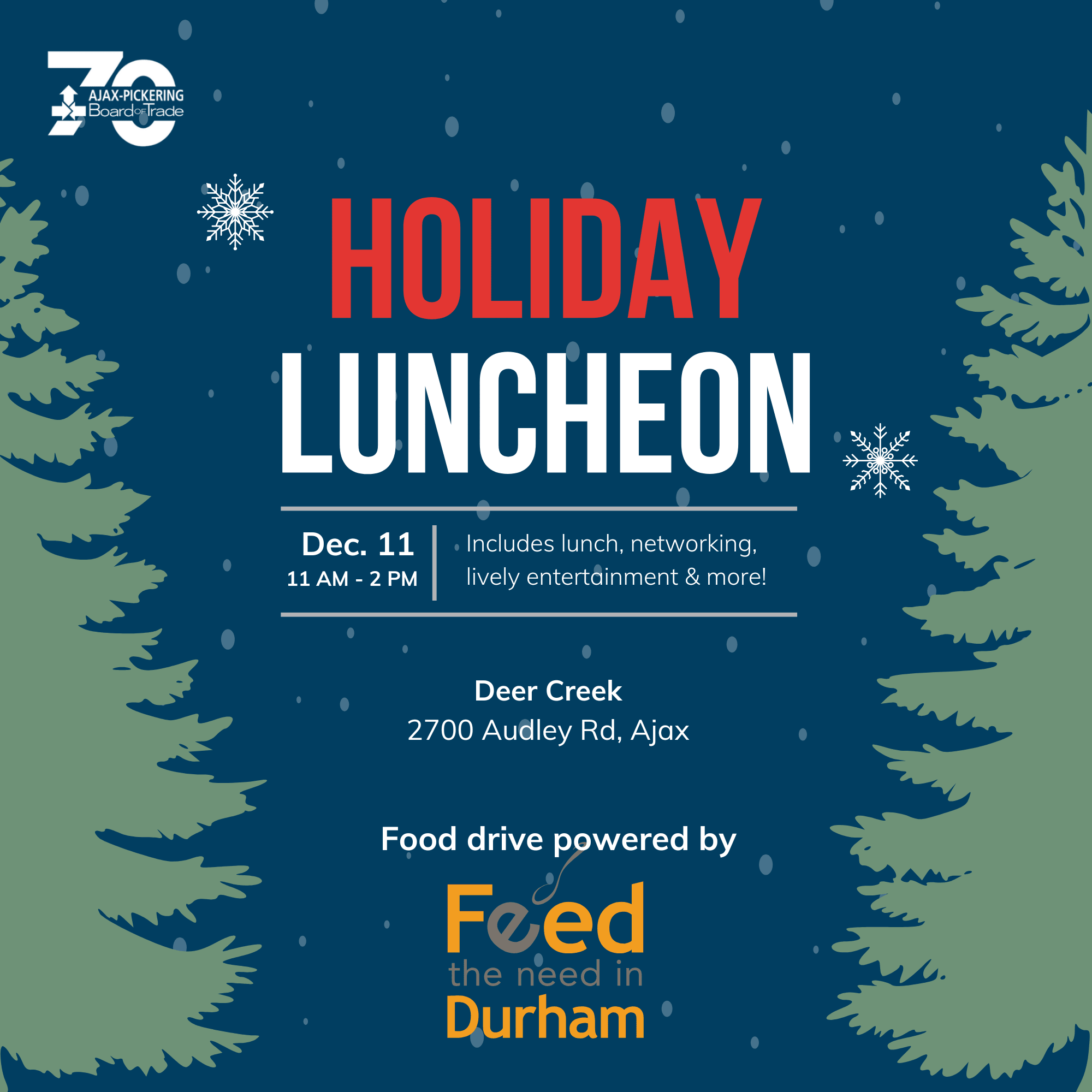 Guests are encouraged to bring a non-perishable food item to Deer Creek on event day or drop off donations at the Ajax-Pickering Board of Trade office (Unit 14 - 190 Harwood Ave S, Ajax) anytime between December 1 and 17. Together, we can help make the season brighter for those in need.